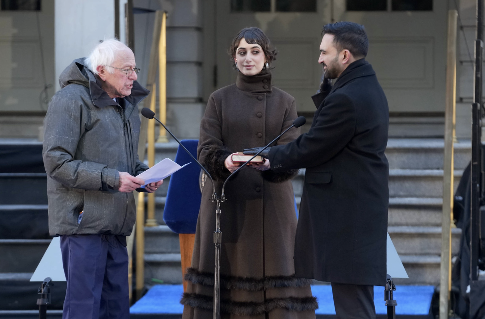 当天中午,在市政厅举行了盛大的公开典礼,由佛蒙特州参议员伯尼·桑德斯(Bernie Sanders)主持宣誓,众多支持者在严寒中到场见证这一“新时代”的开始。