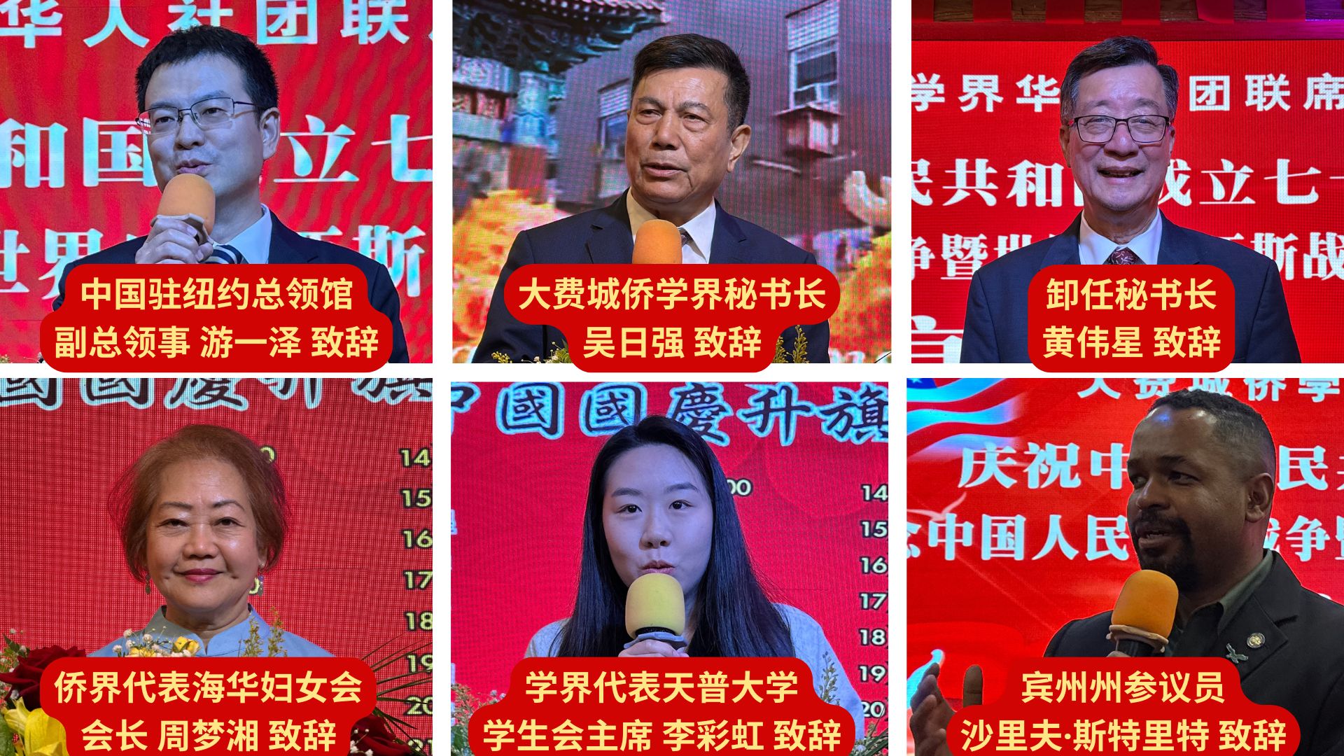 卸任秘书长黄伟星分享了受邀请前往北京观看抗战胜利80周年纪念大会的震撼体验,述说祖国强盛激发的民族自豪感。侨界代表海华妇女会会长周梦湘、学界代表天普大学学生会主席李彩虹分别发表讲话,诠释侨胞与学子的家国情怀。