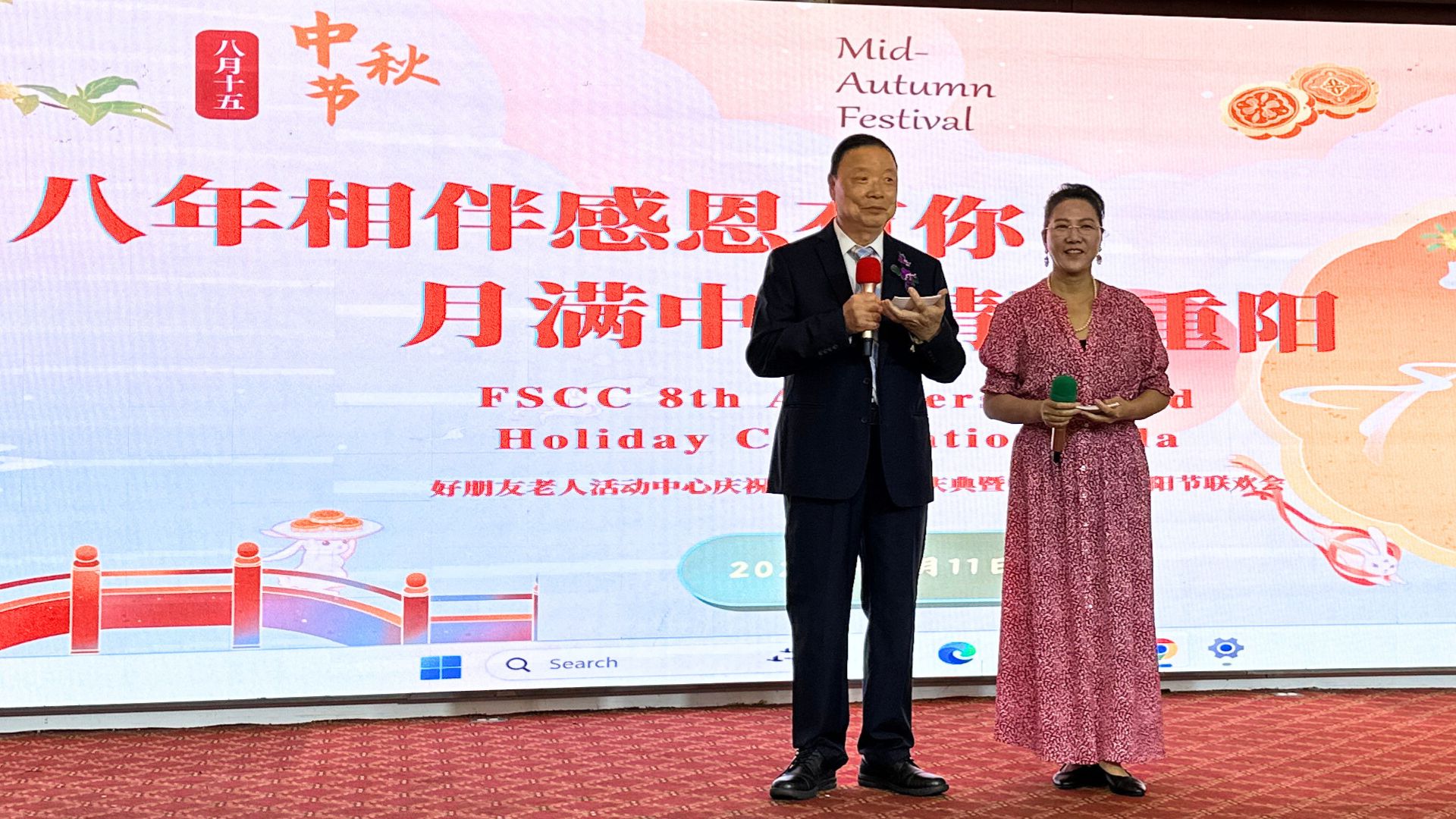 活动由好朋友老人活动中心董事长任美清女士与郑如旭先生与共同主持,二人默契配合,以温情又活泼的风格串联全场。开场时,任美清用 “用歌声传递团圆喜悦,用舞步描绘美好生活” 开启活动篇章,郑如旭以 “月到中秋分外明,人逢佳节倍思亲” 描绘节日氛围。
