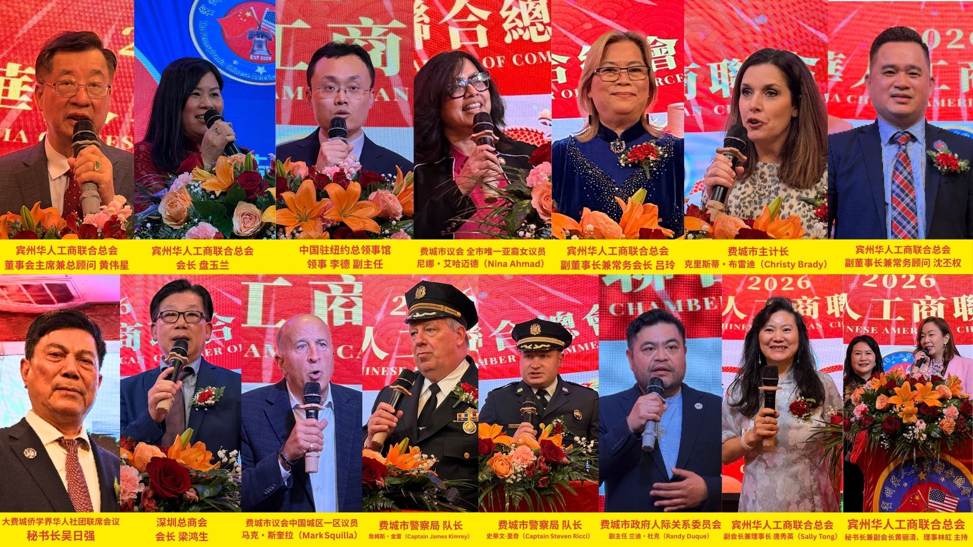 中华人民共和国驻纽约总领事馆领侨处(侨务组)副主任、领事李德,领事周凯良;宾州州长亚太裔事务委员会主任拉津・卡鲁(Razin Karu)、主席陈威;费城市主计长克里斯蒂・布雷迪(Christy Brady)、全市唯一亚裔女议员尼娜・艾哈迈德(Nina Ahmad)、费城市议会中国城区一区议员马克・斯奎拉(Mark Squilla);费城市政府人际关系委员会副主任兰迪・杜克(Randy Duque);费城市警察局队长史蒂文・里奇(Captain Steven Ricci)与队长詹姆斯·金雷警长(Captain James Kimrey)携辖区警员代表共同出席。社区侨领、商界精英及各界友人齐聚一堂,共同见证商会换届履新,共话侨社发展,共庆佳节双喜。
