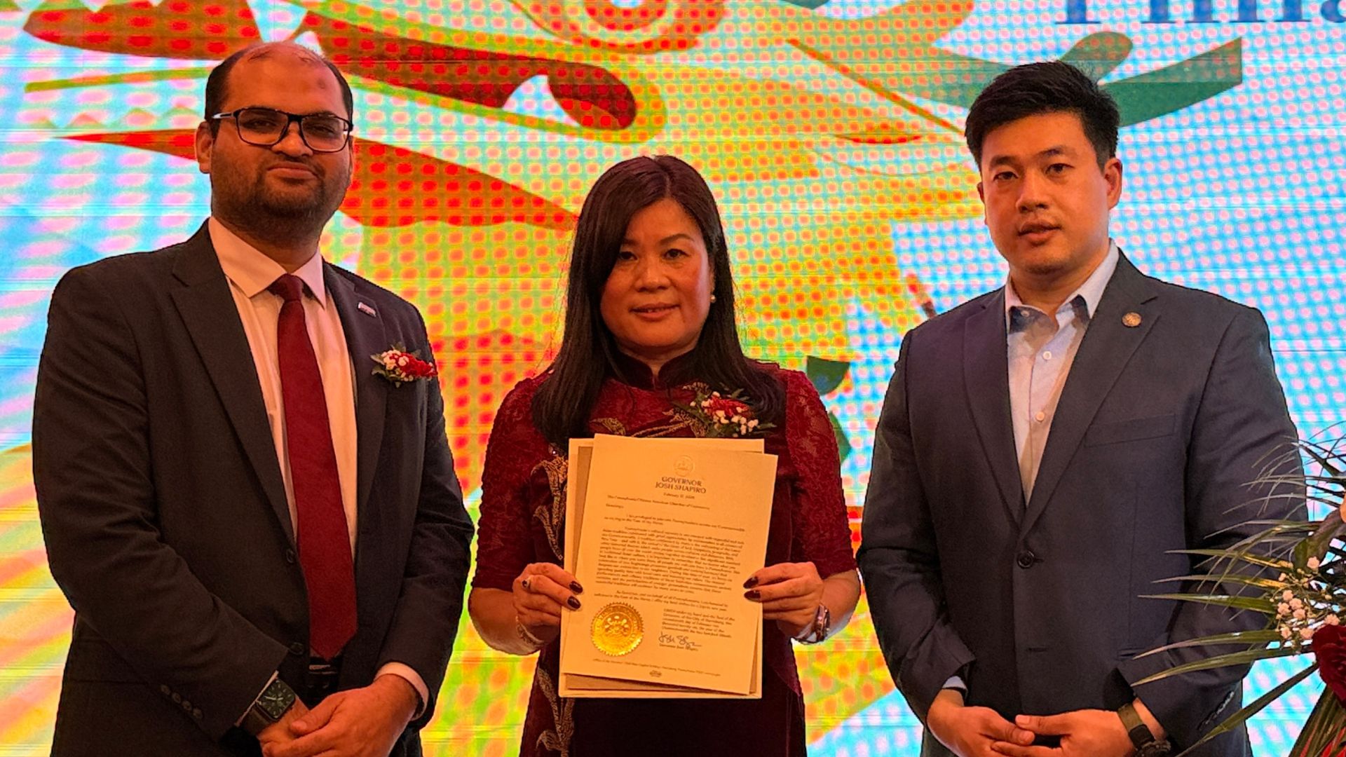 宾州亚太裔事务委员会主任拉津・卡鲁(Razin Karu)、主席陈威,现场宣读宾州州长乔希・夏皮罗(Josh Shapiro)的亲笔贺函,送上诚挚祝贺。