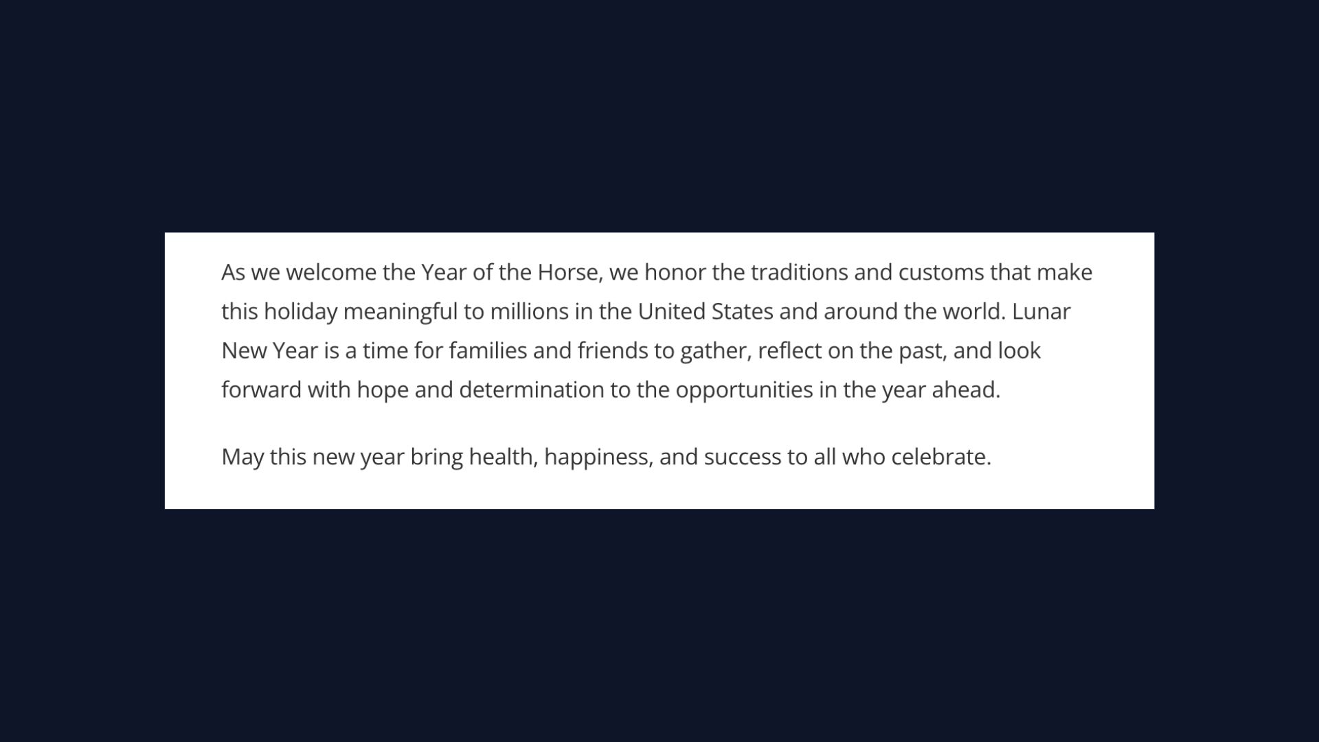 在迎接农历马年之际,我们向这一节日所承载的传统与习俗致以敬意。这些传统与习俗使农历新年成为美国以及世界各地数百万人共同庆祝的重要节日。农历新年是家人和朋友团聚的时刻,也是回顾过去,并以希望和坚定信心迎接新一年机遇的时刻。