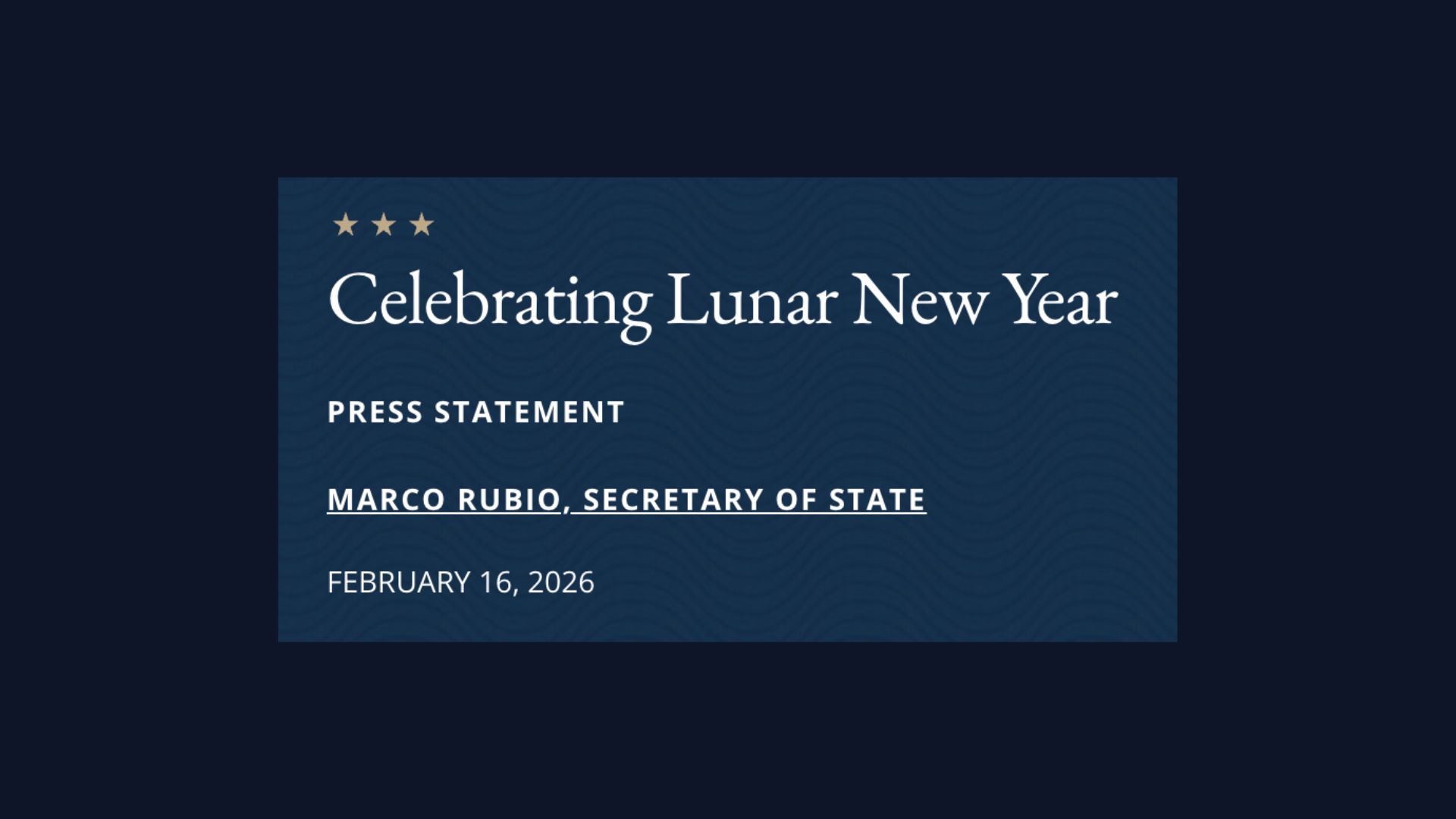 【美华社 2026年2月16日 华盛顿特区讯】美国国务卿马可·卢比奥(Marco Rubio)发表农历新年贺词,向在美国及世界各地庆祝农历新年的人们致以节日祝福。以下为贺词中文译文。