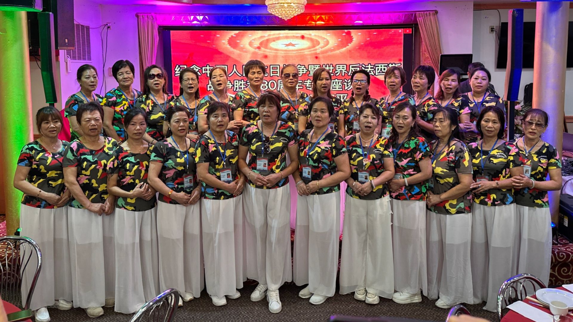 随后,大费城华人妇女联合会合唱团献上经典抗日歌曲《松花江上》,悠扬而深情的旋律勾起了人们对历史的追忆。歌声结束后,陈展远、侯立宏、张子爱、潘焱、周凯良、张文钦、卢文斌、沈丕权、王玉明等嘉宾共同登台合影,定格这一意义非凡的时刻。