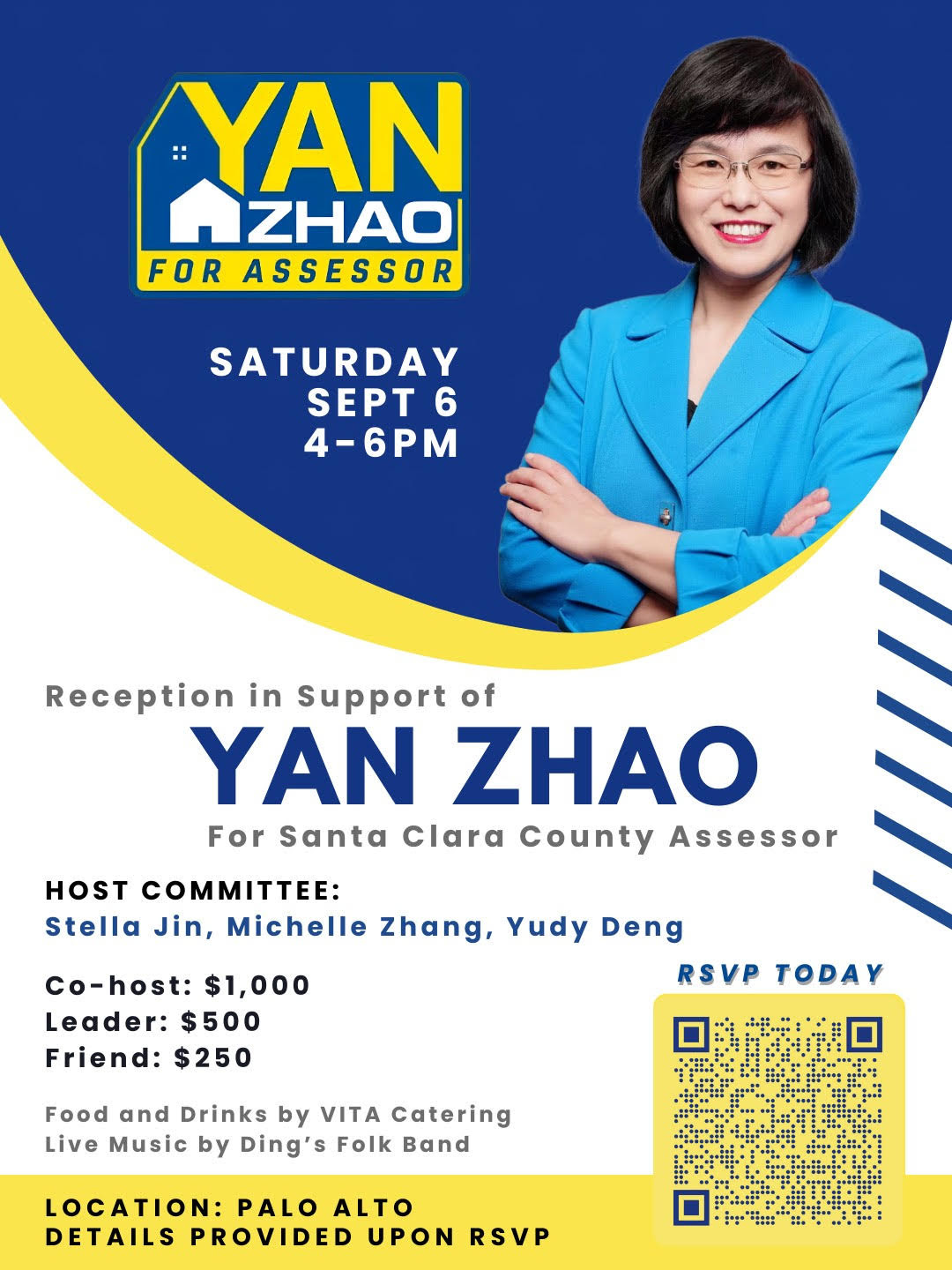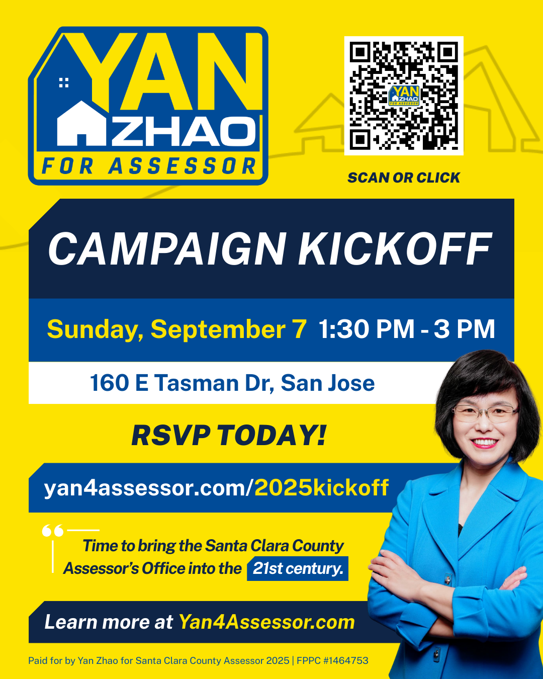 【美华社讯 | 2025年9月6日】 前萨拉托加市长、持证住宅估价师 赵燕(Yan Zhao)将于 明日(2025年9月7日,周日)下午1:30 在圣何塞 Q Bay Center(160 E Tasman Dr) 举行竞选启动大会,正式宣布参选 圣克拉拉县评估官(Santa Clara County Assessor)。