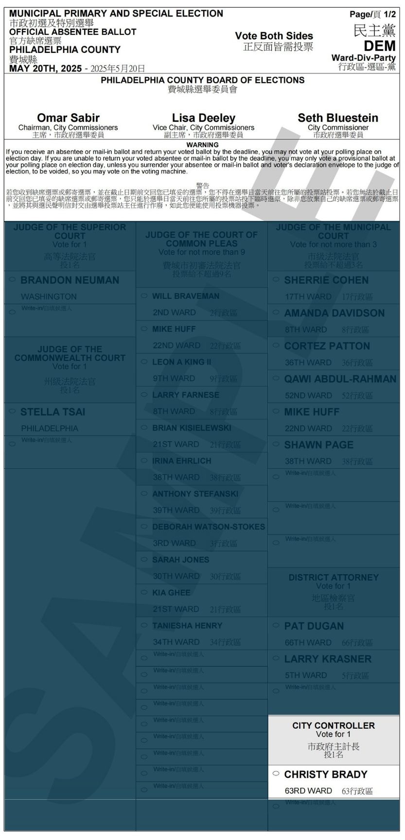 克里斯蒂·布雷迪(Christy Brady)将出现在2025年5月20日的民主党初选选票上,选票编号为[22]。