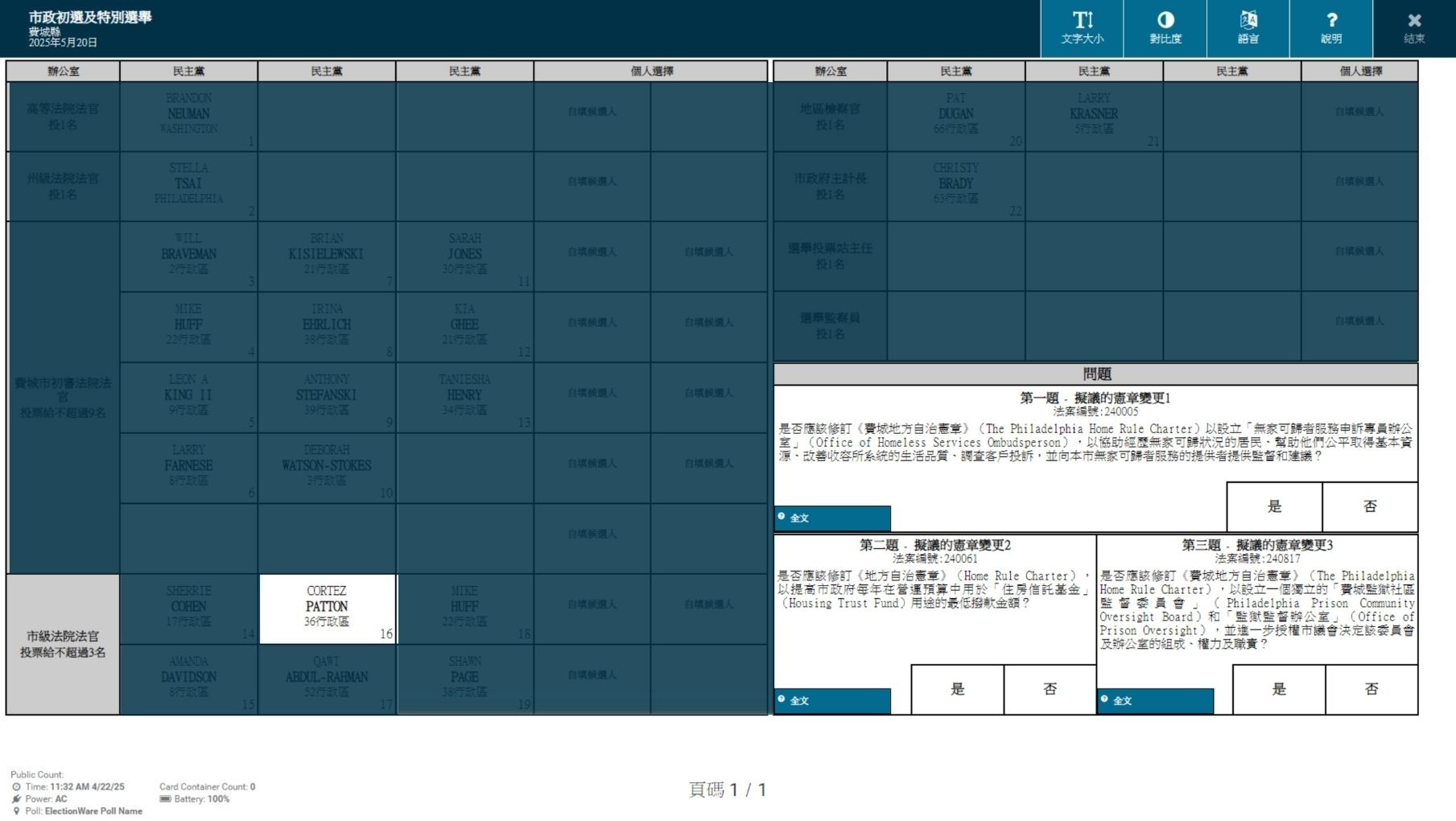 “科尔特兹·帕顿 Cortez Patton”将出现在2025年5月20日民主党初选选票上。如使用电子投票机,其选票号码为16。