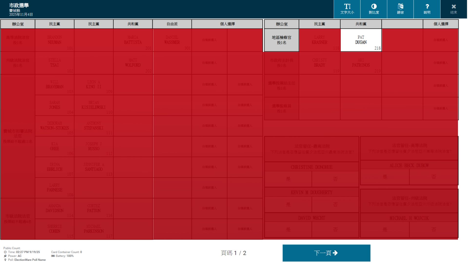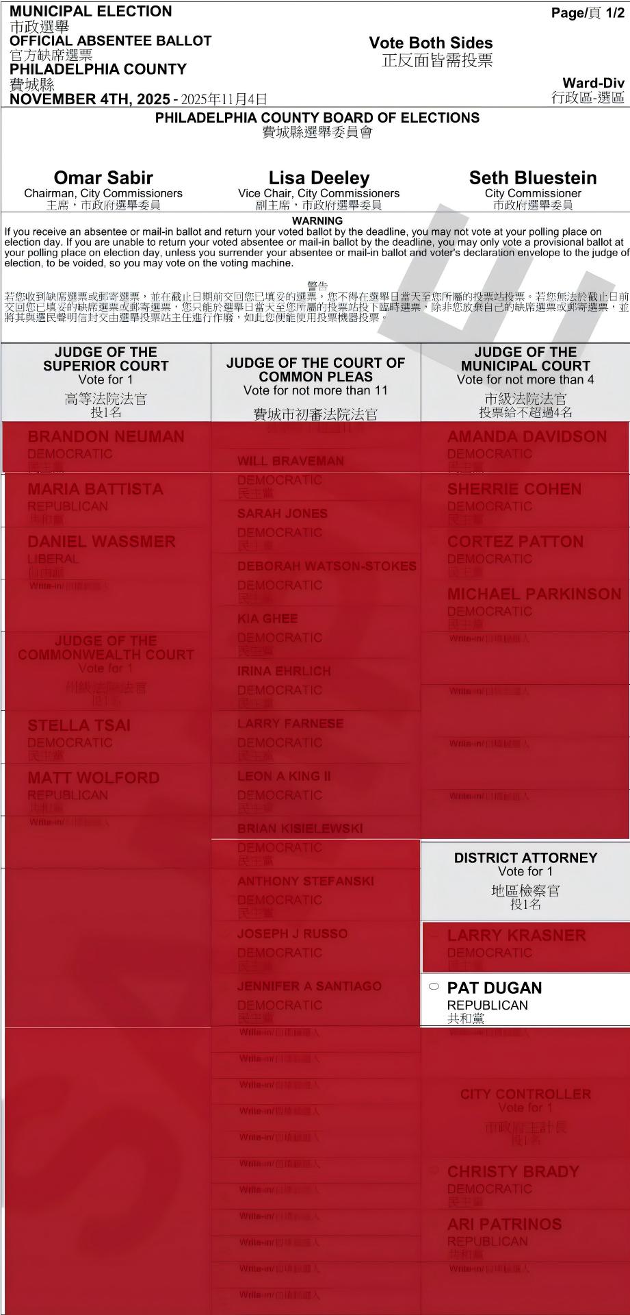2025年8月9日,前法官帕特·杜根(Pat Dugan)竞选团队公布,其通过“历史性写入投票”获共和党提名,参加11月4日的费城地方检察官选举。