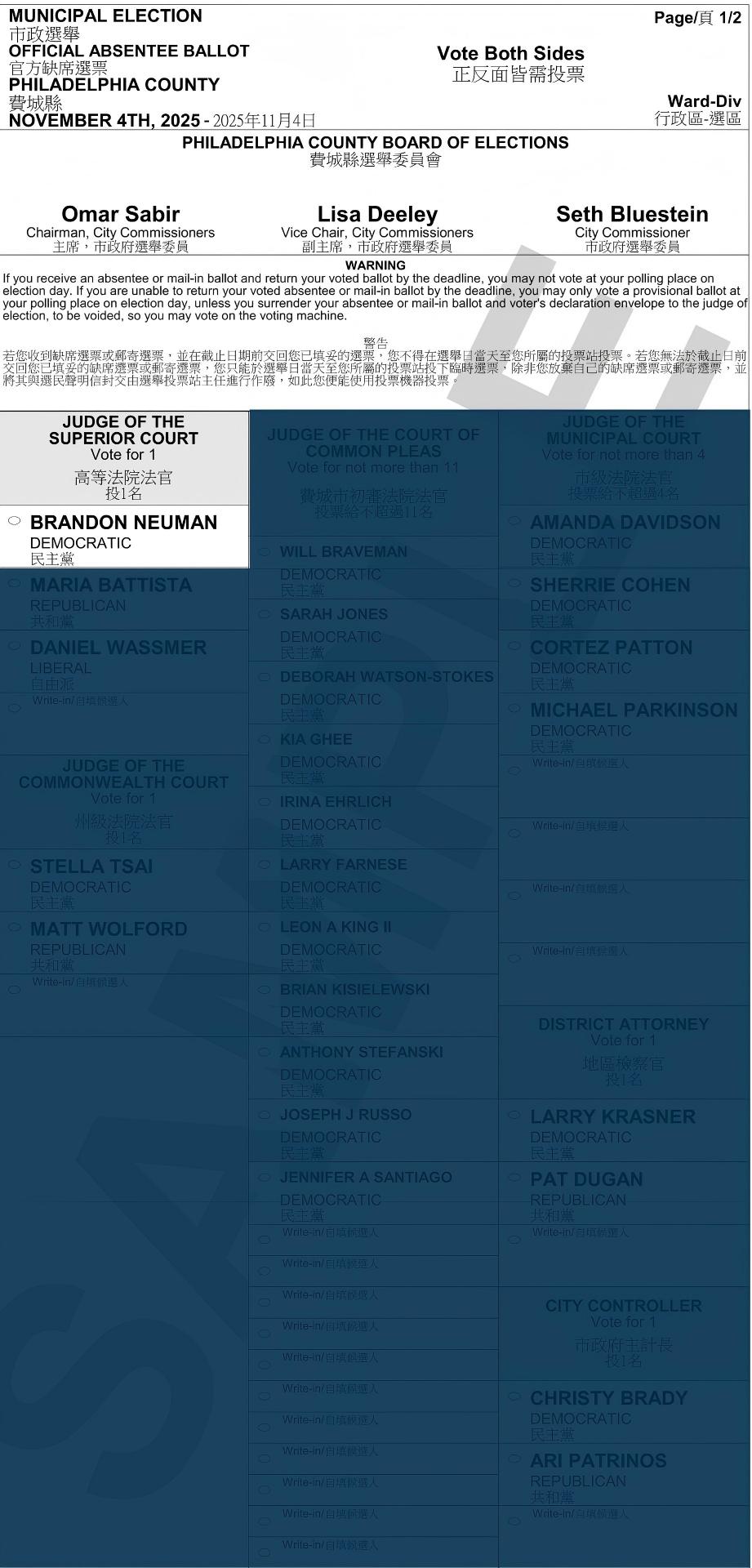【CUS 美华社 – 费城讯】2025年11月3日,布兰登·纽曼(Brandon Neuman)作为宾夕法尼亚州高等法院法官候选人,代表民主党参选,并在2025年选举中列为第 [101] 号候选人。选举将于2025年11月4日举行。