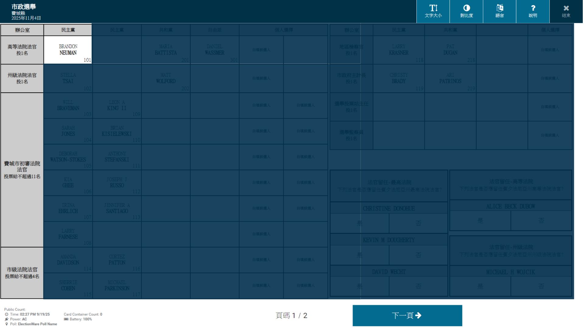 选票机选票是通过电子投票设备呈现的界面样式,候选人姓名及编号将显示在屏幕上,选民根据提示点击选择。样式仅供参考,具体界面以投票现场机器实际显示为准。