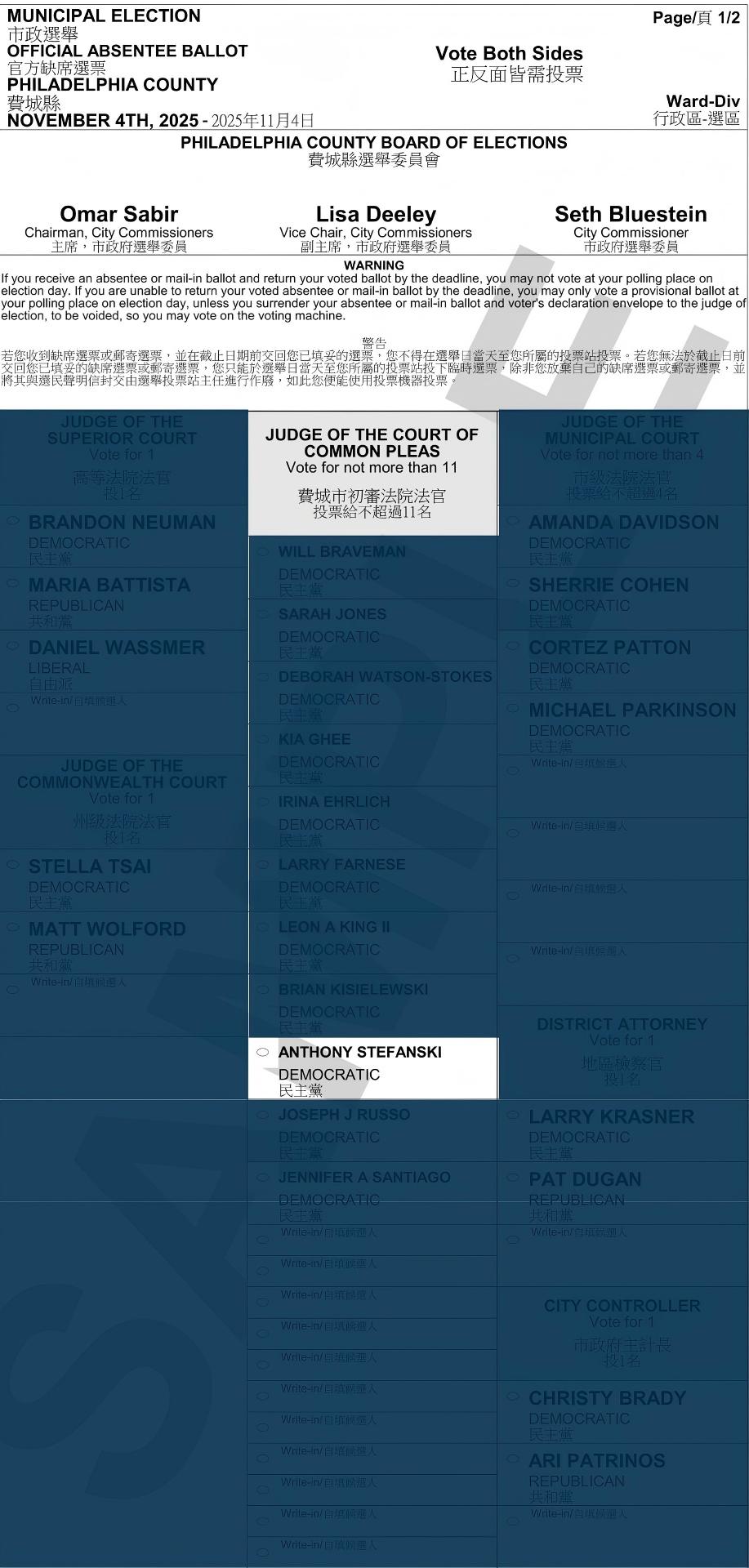 “安东尼·斯特凡斯基 Anthony Stefanski”将出现在2025年11月4日的民主党选票上。如果您使用投票机进行投票,其编号为[111]。