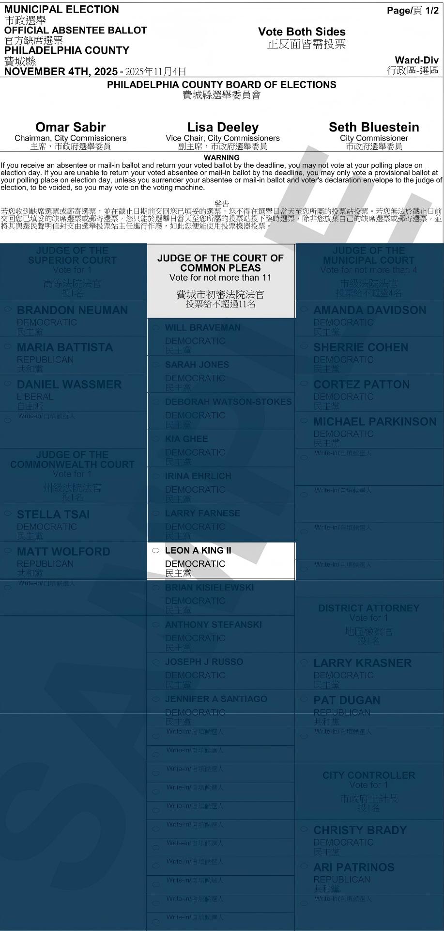 【CUS 美华社 – 费城讯】2025年11月4日,莱昂·A·金二世(Leon A. King II)[109] 正竞选费城市初审法院(Court of Common Pleas)法官一职。