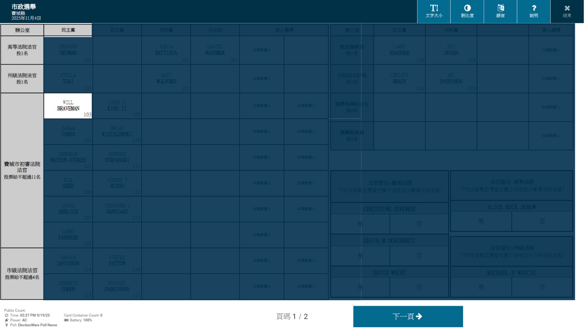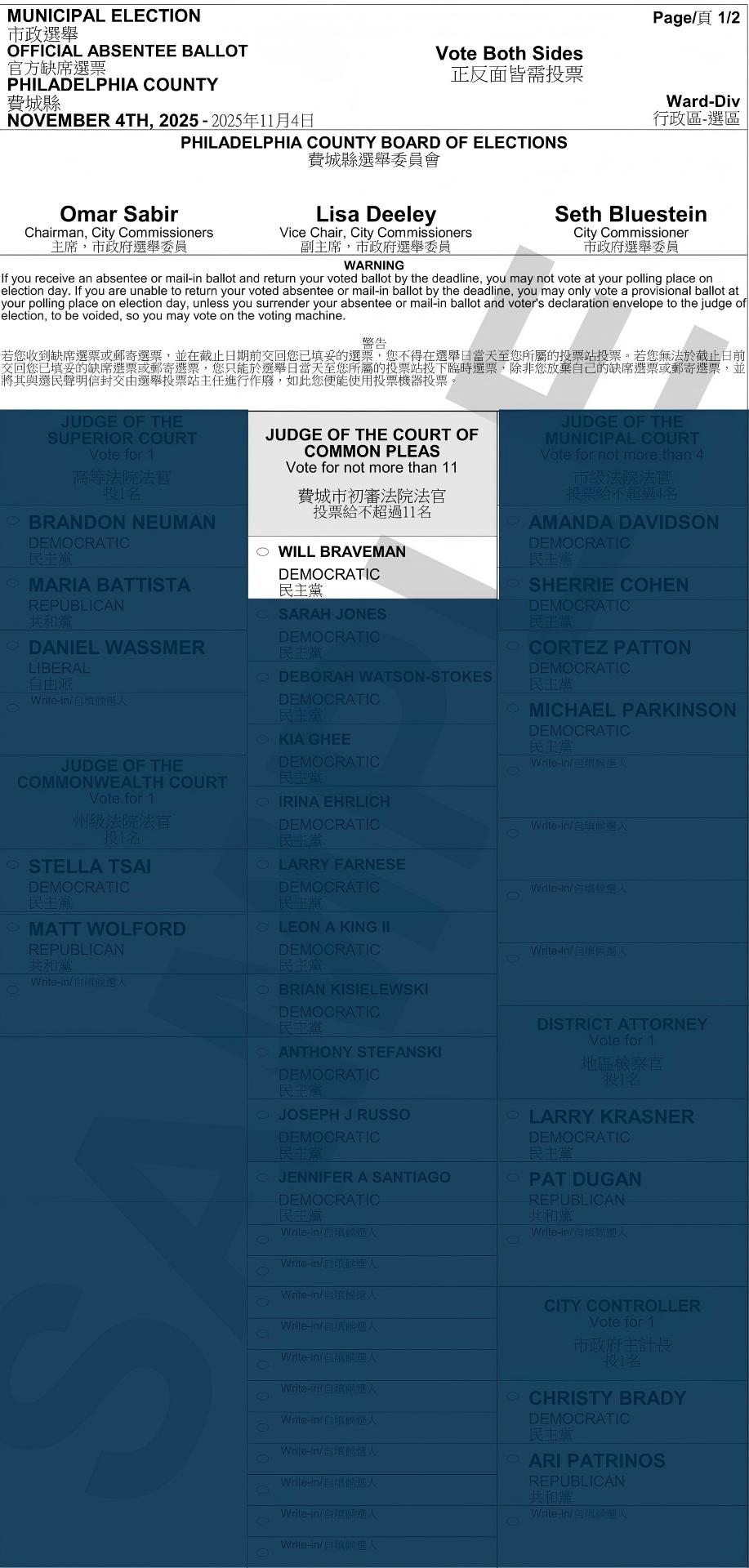 【CUS 美华社 – 费城讯】2025年11月4日,威尔·布雷夫曼(Will Braveman)[103] 正参选费城市初审法院法官(Philadelphia County Court of Common Pleas)一职,他是一位具有数十年法律经验的审判律师。此次选举共有多位候选人参选,将选出多名新法官。