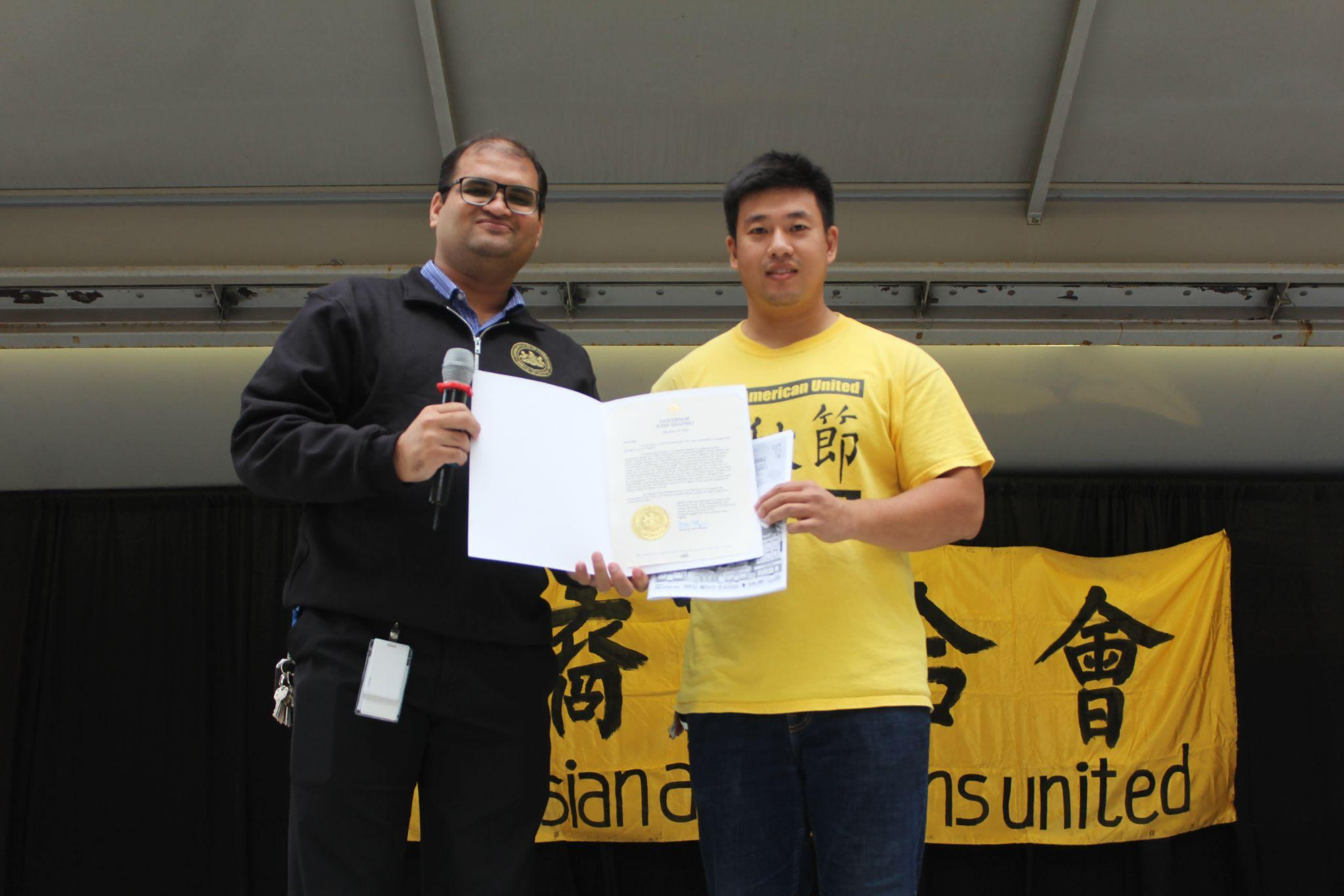 宾州州长亚太事务委员会主任Razin Karu致词并送上州长贺函, AAU亚裔联合会公民参与主任兼宾州州长亚太事务委员会主席 陈威 接受州长贺函
