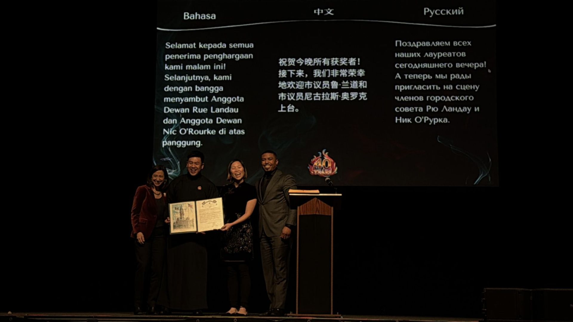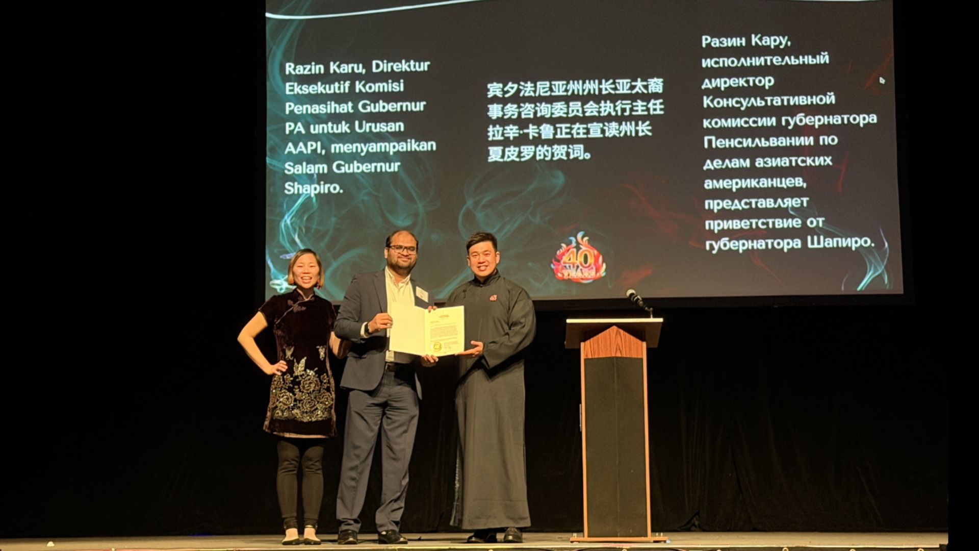 费城市议会议员鲁·兰道(Rue Landau)、尼古拉斯·V·奥罗克(Nicolas V. O’Rourke)与宾夕法尼亚州州长亚太裔事务委员会执行主任 拉辛·卡鲁(Razin Karu)均出席庆典,分别颁发贺信,高度肯定AAU亚裔联合会四十年来在推进社会公平正义、赋能亚裔社区、丰富城市多元文化方面的卓越贡献。AAU 现任执行主任 张良琪(Vivian Chang )在致辞中重申,未来将继续以 “增强移民社区力量、守护挚爱的街区、培养下一代青年领袖” 为核心使命,与社区成员携手并肩,让中国城始终成为充满希望、包容与文化力量的家园。