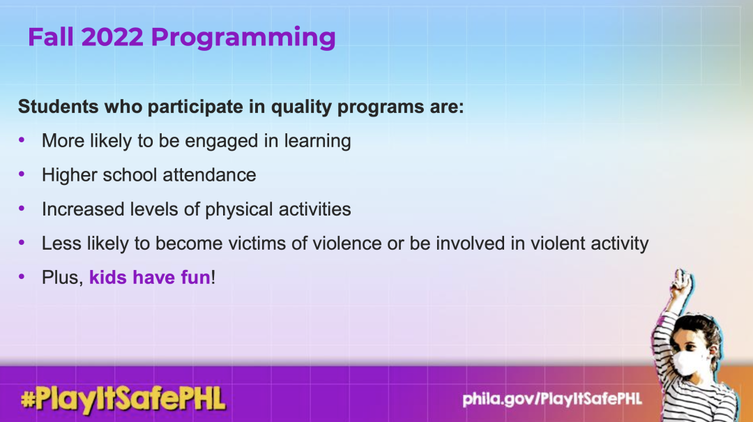 负责儿童和家庭的副市长Vanessa Garrett Harley表示:”我们投资于各种项目,因为几十年的研究证实,参与的学生更有可能参与学习,他们也可能有更好的学校出勤率,增加体育活动水平,并且不太可能成为暴力的受害者或参与暴力活动。”