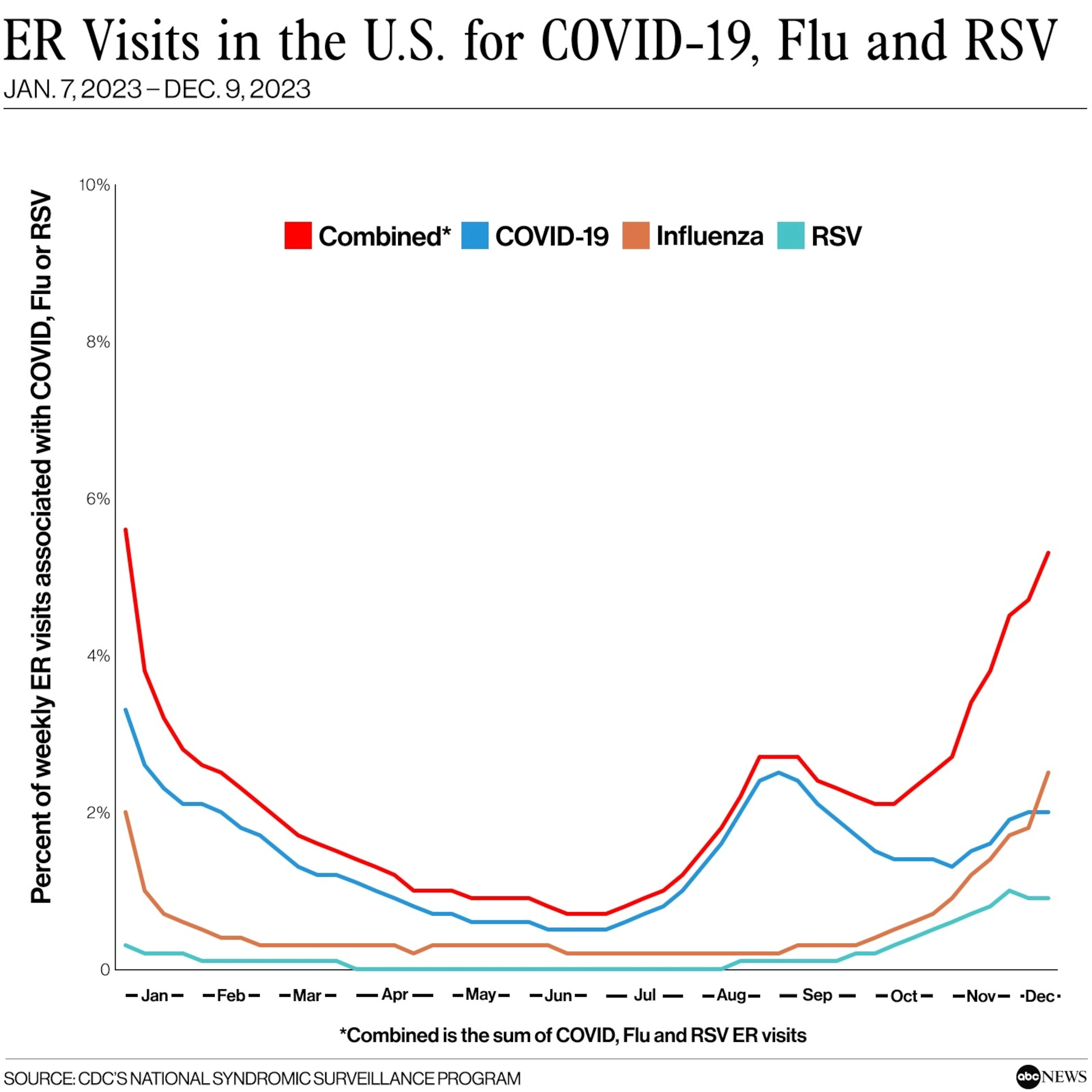 流感和新冠双重袭击, CDC数据显示急诊就诊率持续攀升 Posted on 2023-12-232023-12-27 by Ryan 美国疾病控制和预防中心的数据显示,流感和 COVID-19 的急诊就诊率和住院率在全美持续上升,而疫苗接种率却有所滞后。 本周二,世界卫生组织将”JN.1″COVID变异体–Omicron变异体的一个子变异体–列为”关注变异体”。据美国疾病预防控制中心(CDC)估计,该变异目前占美国新发病例的21%。 此外,据匹兹堡ABC附属电视台WTAE报道,本周三,匹兹堡大学医疗中心的所有设施都要求佩戴口罩。匹兹堡大学医疗中心表示,将对病例进行监测,并在必要时对协议进行调整。