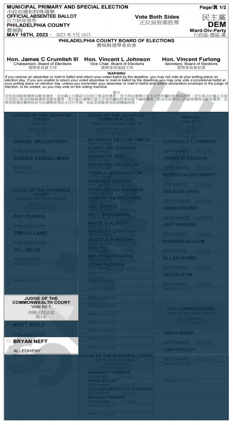 Bryan Neft(民主党)正在参加宾夕法尼亚州州级法院法官的选举。2023年5月16日,他的名字将出现在民主党初选选票中,其选票名称为BRYAN NEFT ALLEGHENY, 机选号为#7。