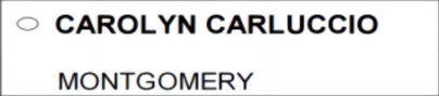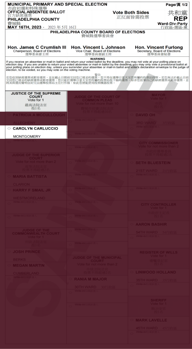 最高法院大法官(共和党)候选人-CAROLYN CARLUCCIO#102 Posted on 2023-05-162024-08-12 by Ryan Carolyn Carluccio是宾夕法尼亚州蒙哥马利县初审法院的法官。她的当前任期将于 2029 年结束。在狄金森学院获得文学学士学位,在威德纳大学获得法学博士学位。职业经历包括担任蒙哥马利县的首席公设辩护人和联邦助理美国检察官。 Carolyn Carluccio(共和党)正在参加宾夕法尼亚州最高法院法官的选举。2023年5月16日,她的名字将出现在共和党初选选票中,其选票名称为CAROLYN CARLUCCIO MONTGOMERY , 机选号为#102。 选票机样本 选票样本