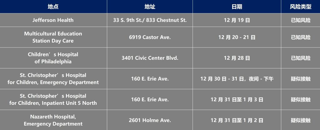 费城卫生部公布了更多可能接触麻疹的地点 Posted on 2024-01-052024-01-05 by Ryan 费城公共卫生部目前正在追踪多名麻疹检测阳性患者。并发出警告,希望所有可能接触过麻疹的人,检查疫苗接种情况。 卫生部门建议接触过麻疹的人自我隔离。如果不确定自己是否有免疫力,且在特定日期和地点接触过麻疹,应立即联系医疗服务提供者或儿科医生。建议在室内公共场所和未接种疫苗的人周围佩戴口罩,以防传染。 如果在所列日期在上述任何地点,可能已经接触过麻疹。