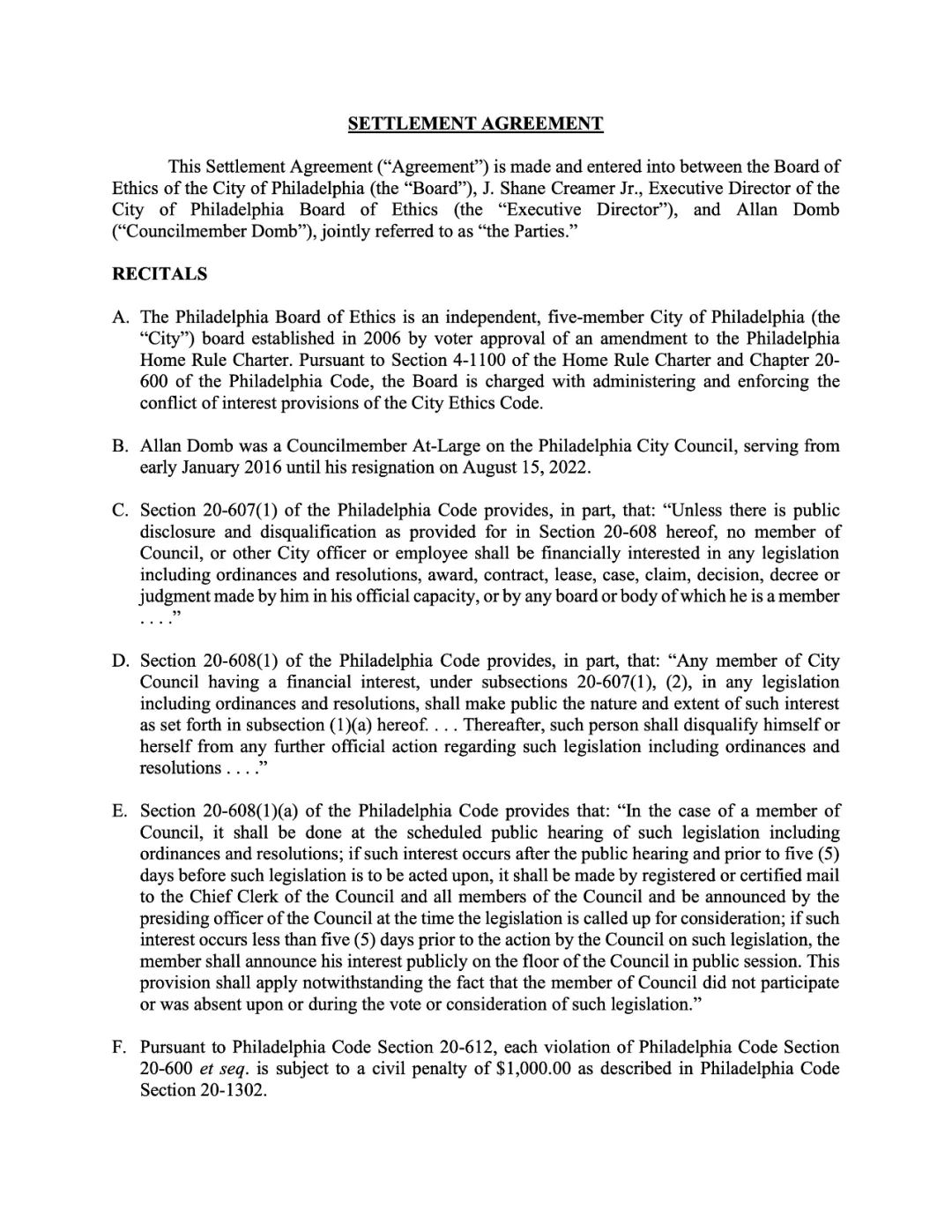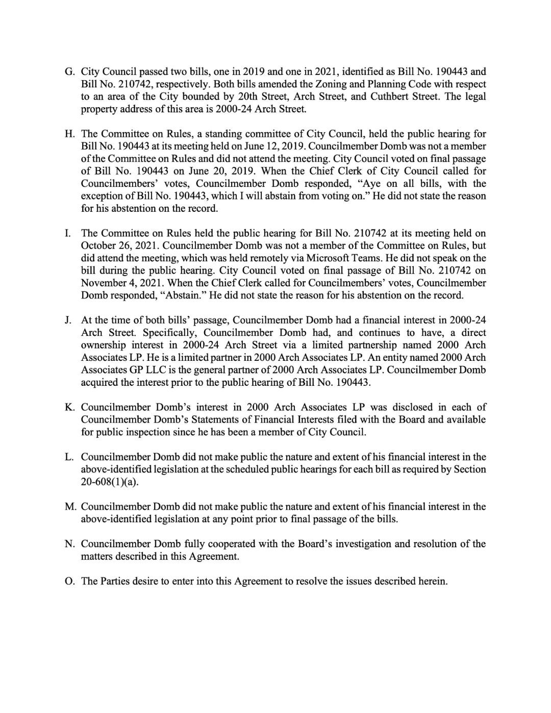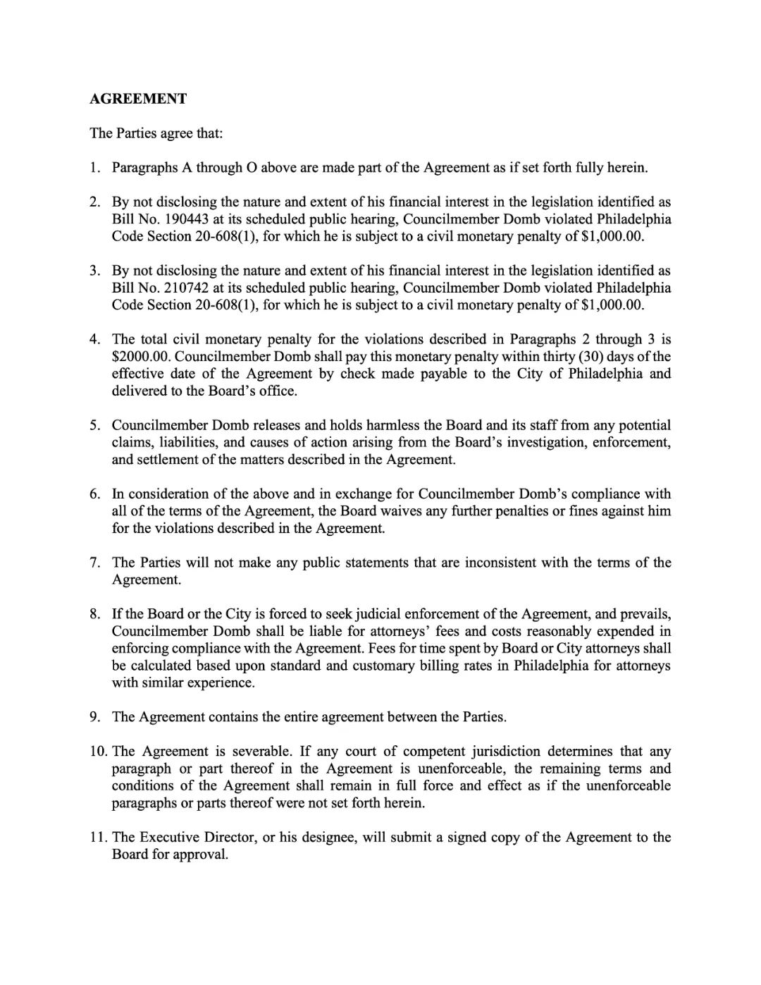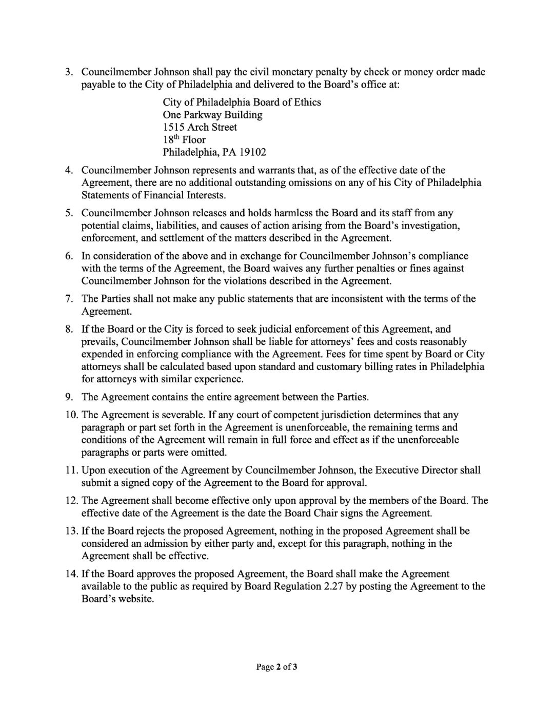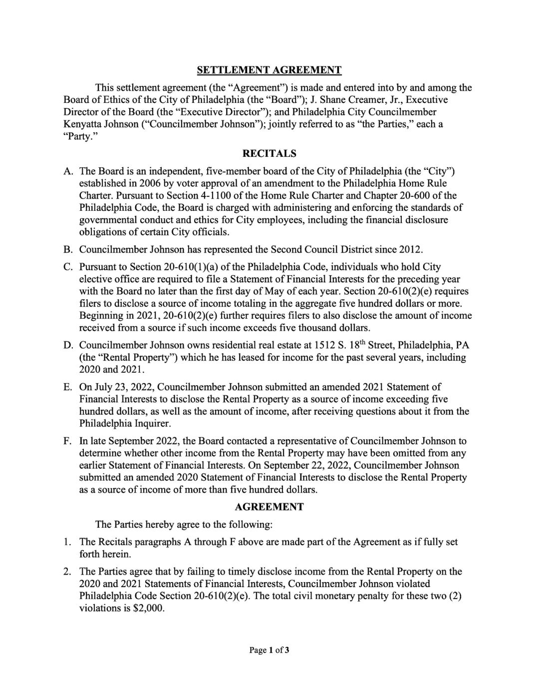 市议员Kenyatta Johnson。解决违反费城《财务利益声明法》,在提交给委员会的财务利益声明中有所遗漏的问题。市议员约翰逊已同意支付2000美元的民事罚款。