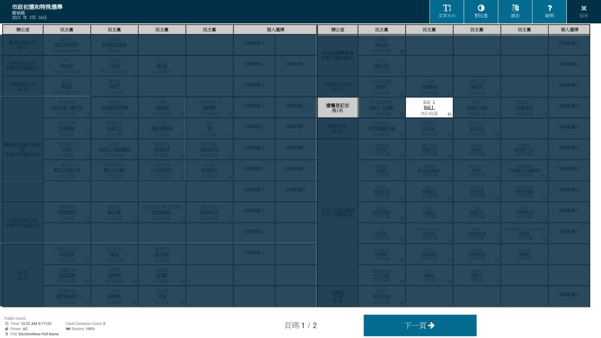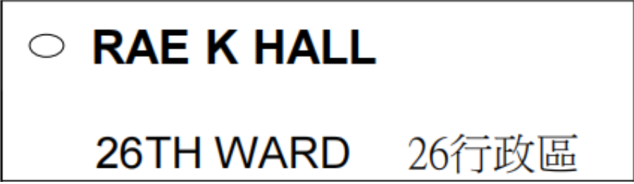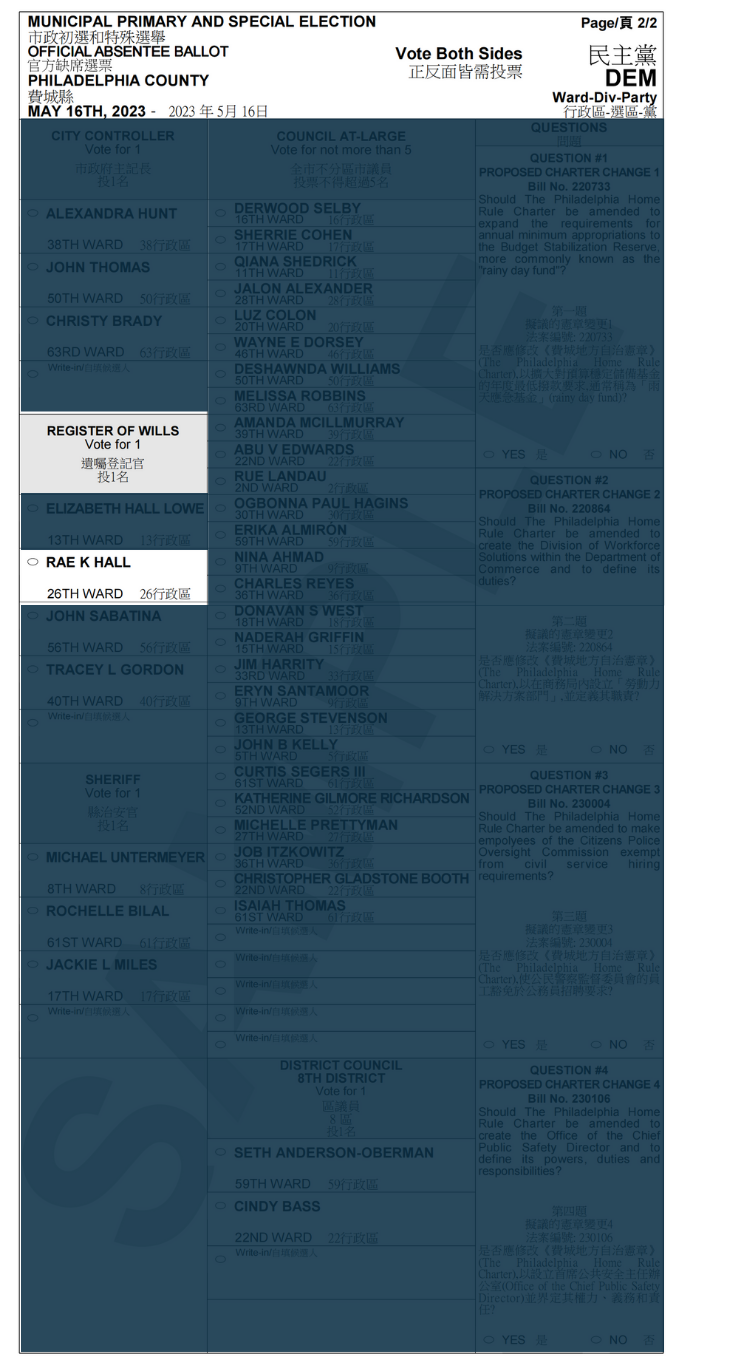 遗嘱登记官(民主党)候选人-RAE K HALL#46 Posted on 2023-05-162023-05-16 by Ryan Rae K Hall(民主党)51 岁的南费城原住民。Hall在市政府工作了近 20 年,包括在遗嘱登记处工作。为前市议会主席Anna Verna工作了六年。在遗嘱执行办公室工作了四年。目前,在市长吉姆·肯尼 Jim Kenney的主任办公室工作,预计于 2023 年卸任竞选公职。 Rae K Hall(民主党)正在参加费城遗嘱登记官的选举。2023年5月16日,她的名字将出现在民主党初选选票中,其选票名称为RAE K HALL, 机选号为#46。 选票机样本 选票样本