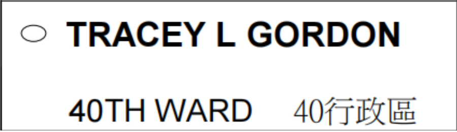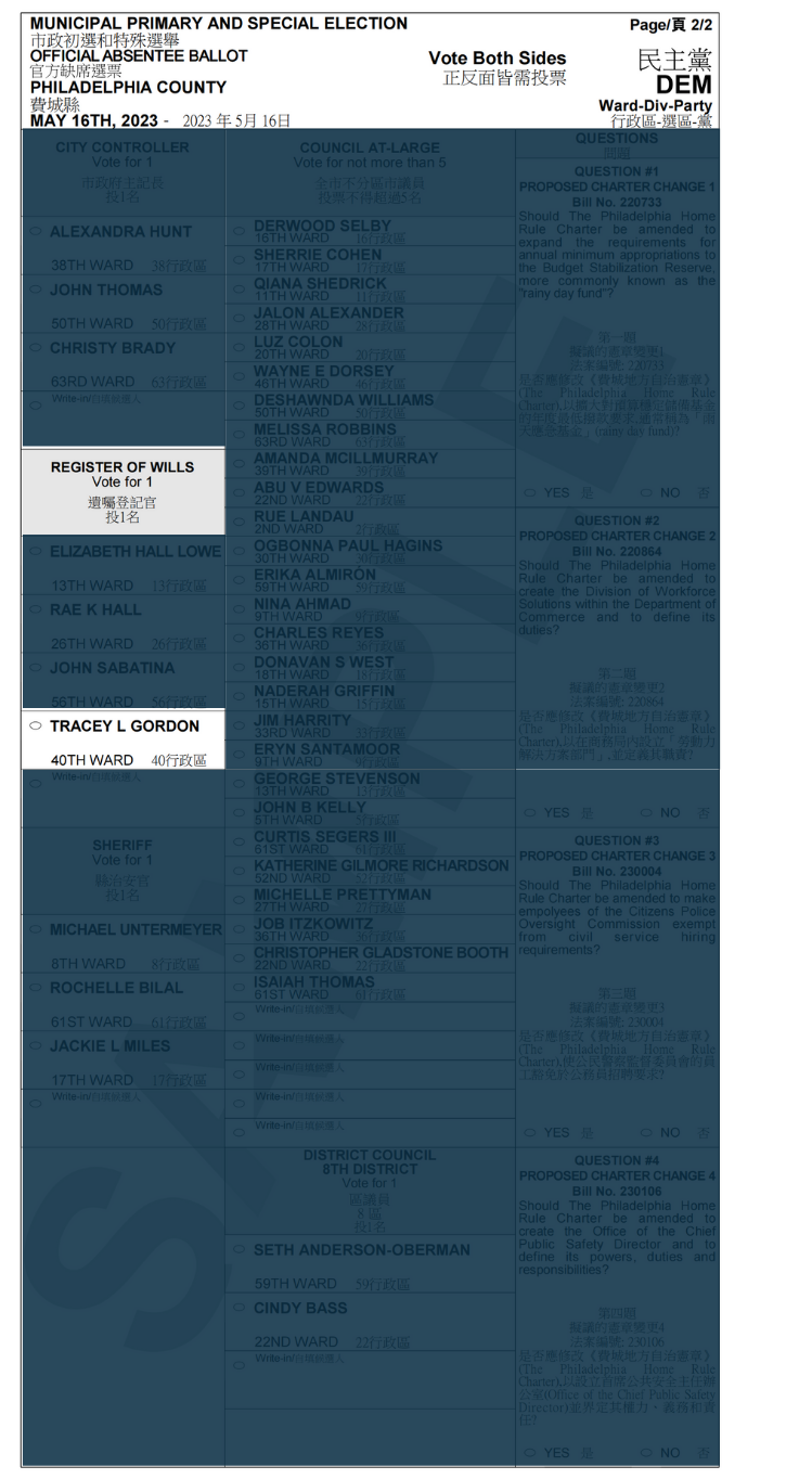 遗嘱登记官(民主党)候选人-TRACEY L GORDON#48 Posted on 2023-05-162023-05-16 by Ryan Tracey L Gordon(民主党)在费城遗嘱登记处工作。2020 年 1 月 6 日上任,本届任期至 2024 年 1 月 1 日结束。正在宾夕法尼亚州费城遗嘱登记处竞选连任。曾担任副城市专员和四次政治候选人,费城西南部的一名委员会成员。 Tracey L Gordon(民主党)正在参加费城遗嘱登记官的选举。2023年5月16日,她的名字将出现在民主党初选选票中,其选票名称为TRACEY L GORDON, 机选号为#48。 选票机样本 选票样本