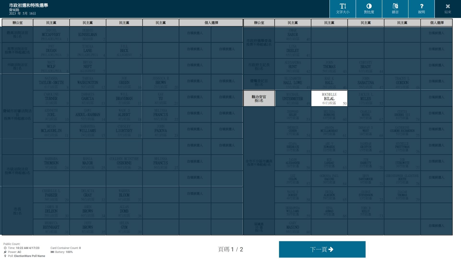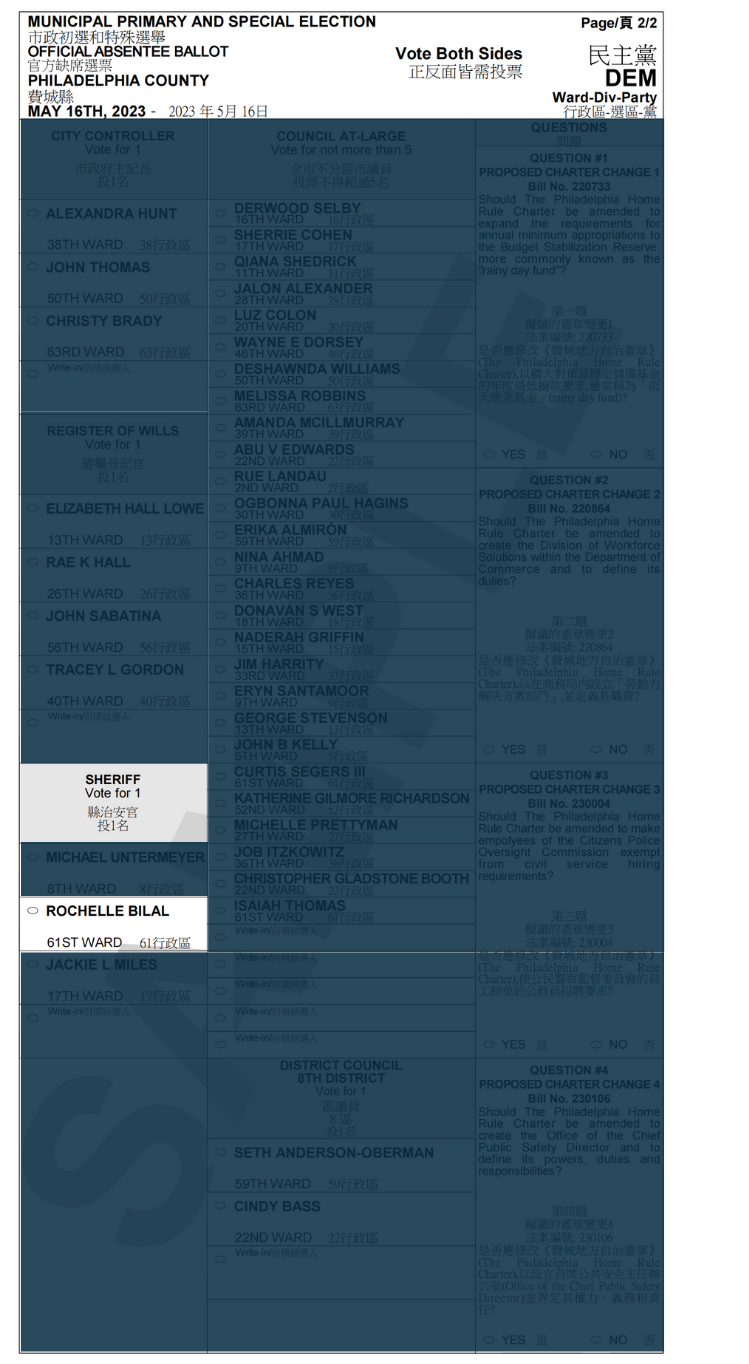 縣治安官(民主党)候选人-ROCHELLE BILAL#50 Posted on 2023-05-162023-05-16 by Ryan Rochelle Bilal(民主党)作为费城历史上第一位非裔美国女性警长。2020年1月6日就任,本届任期至2024年1月1日届满。正在竞选宾夕法尼亚州费城警长的连任。曾就读于Community College of Philadelphia。 Rochelle Bilal(民主党)正在费城縣治安官的选举。2023年5月16日,她的名字将出现在民主党初选选票中,其选票名称为ROCHELLE BILAL, 机选号为#50。 选票机样本 选票样本