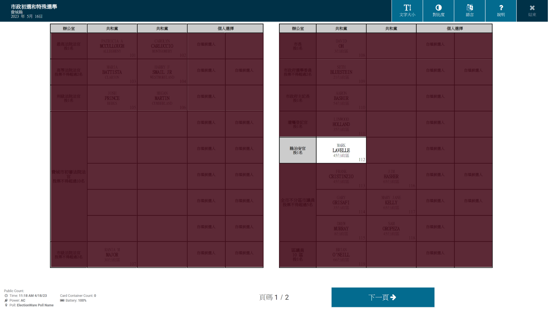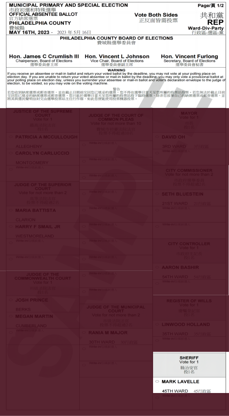 縣治安官(共和党)候选人-MARK LAVELLE#112 Posted on 2023-05-162024-08-12 by Ryan Mark Lavelle(共和党)有多年仓库经理经验,致力于倾听、学习和领导。在家人、朋友和信仰的帮助下,将尽最大的努力为地区提供领导,并尽最大的努力为同龄人提出的问题提供解决方案,以改善生活质量问题,并与执法部门合作,确保街道安全。 Mark Lavelle(共和党)正在参加费城縣治安官的选举。2023年5月16日,她的名字将出现在共和党初选选票中,其选票名称为MARK LAVELLE, 机选号为#112。 选票机样本 选票样本